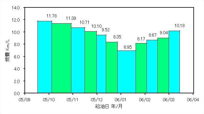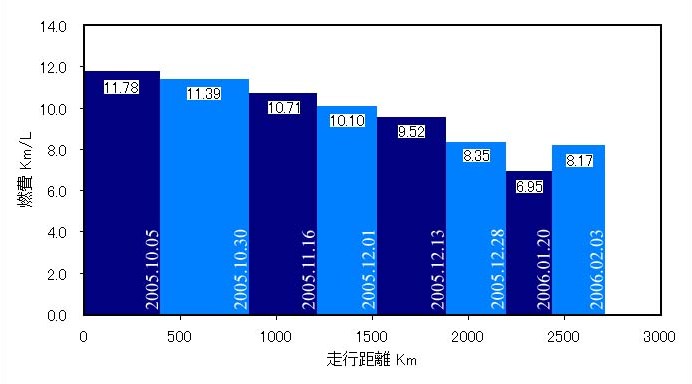 納車してから今までの燃費。給油の度に燃費が悪くなっ